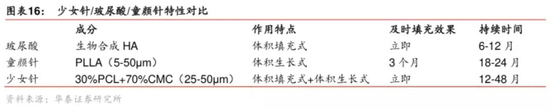 事实上,在“少女针”之前,也有多款主打用于鼻唇沟皱纹填充的产品,主要包括玻尿酸产品,比如爱美客的注射用修饰透明质酸钠凝胶、医用透明质酸钠-羟丙基甲基纤维素凝胶;昊海生科的注射用交联透明质酸钠凝胶、注射用修饰透明质酸钠凝胶等产品均可通过皮下层注射,均用于纠正中、重度鼻唇沟皱纹。但相较于玻尿酸填充剂,玻尿酸填充剂只是修饰性填充(打完吸收后短期恢复原样),Ellansé少女针的CMC成分虽然同样却会被人体所吸收,但另一成分PCL发挥功用,刺激体内的胶原蛋白增生,取代被吸收的凝胶载体,让皮肤停留在施打时的效果,保持少女般的容颜,“从根本上治疗面部衰老”。