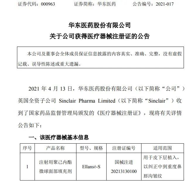 近日,华东医药发布公告称,其英国全资子公司Sinclair(曾于2018年被华东医药以1.69亿英镑价格收购)的产品Ellansé“少女针”收到国家药品监督管理局颁发的《医疗器械注册证》,可用于皮下层植入,以纠正中、重度鼻唇沟皱纹。