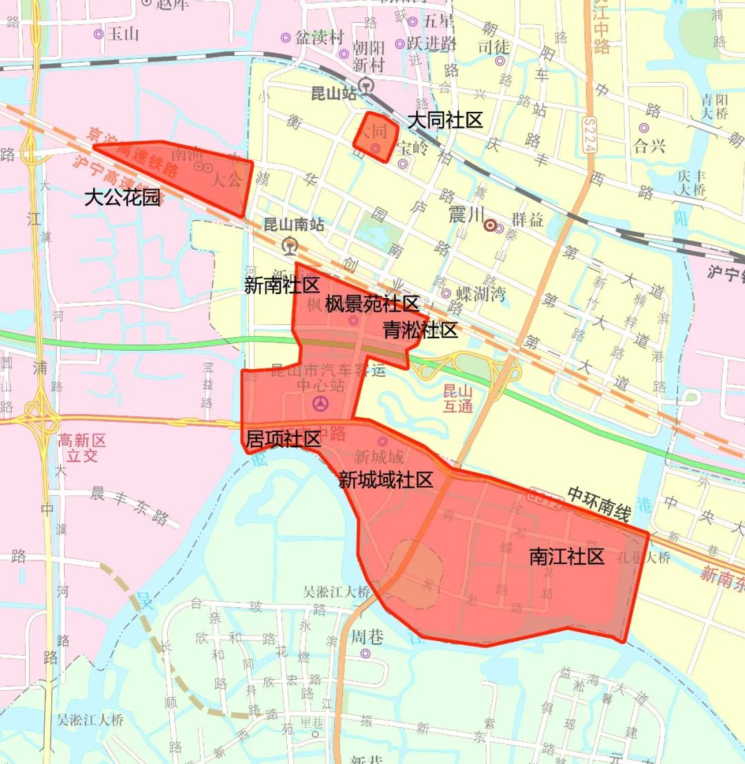 昆山高新区南江社区、新城域社区、大同社区、枫景苑社区、青淞社区、新南社区、居项社区以及大公花园的全体居民(具体区域见图)。