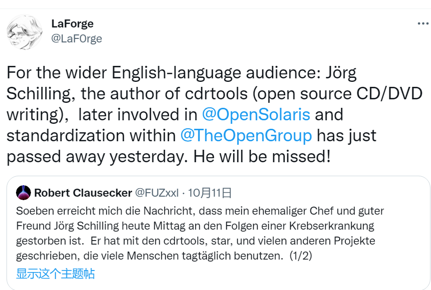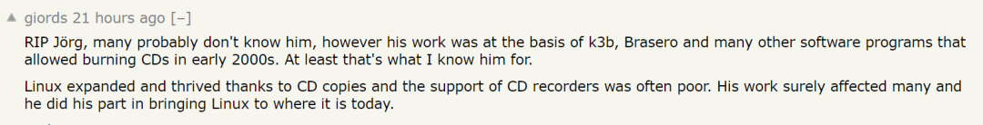 如今,Jörg Schilling去世的噩耗传来,网友们纷纷对这位特立独行的程序员的离去表示哀悼。