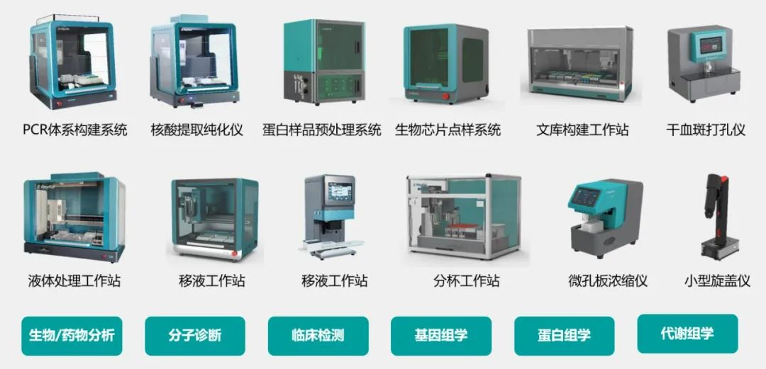 公司研制自动化生物样品前处理设备,服务于生物/药物分析、分子诊断、临床检测、基因组学、蛋白组学、代谢组学等领域。已正式推出生命科学前处理设备,包括全自动核酸提取纯化仪、PCR体系构建系统、文库构建工作站、全自动蛋白组学前处理工作站、移液工作站、分杯系统、干血斑打孔仪、生物芯片点样系统、临床质谱前处理系统等产品。