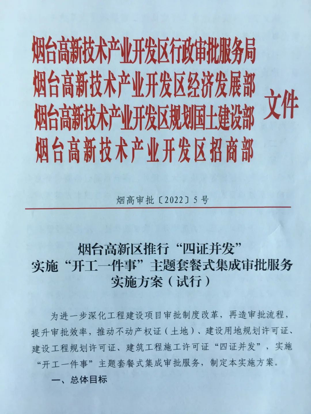 2022年新年伊始,烟台市行政审批局等4部门联合对《烟台市“拿地即开工”项目审批实施方案》进行了修订,烟台高新区第一时间传达学习、深挖精髓,结合实际、研究落实,在烟台各县市区中率先印发《烟台高新区推行“四证并发”实施“开工一件事”主题套餐式集成审批服务实施方案(试行)》,努力绘就“拿地即开工”升级版。