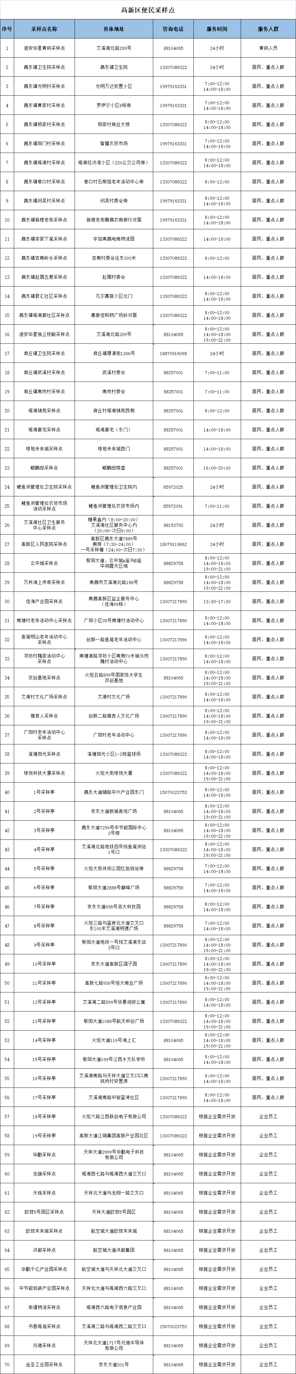 为贯彻落实“外防输入、内防反弹”总策略和“动态清零”总方针,进一步优化核酸采样便民服务,打造“15分钟便民核酸采样圈”,在高新区设置便民采样点位70处,现公告如下: