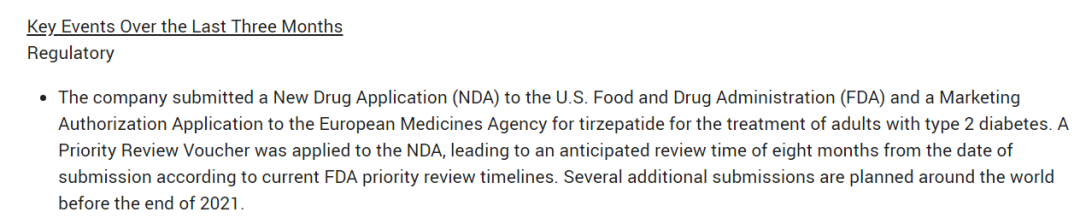 10月26日,礼来宣布已经向美国FDA和欧盟EMA提交了tirzepatide的新药上市申请,并且向FDA提交NDA资料时同时附上了一张优先审评券,以加快tirzepatide上市。