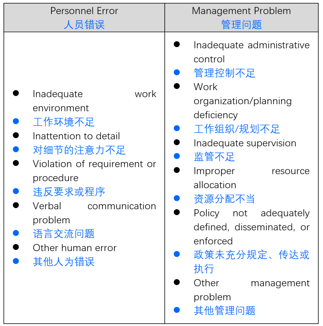 下表列出了与操作人员和管理人员相关的根本原因中可能出现的不同类型的问题: