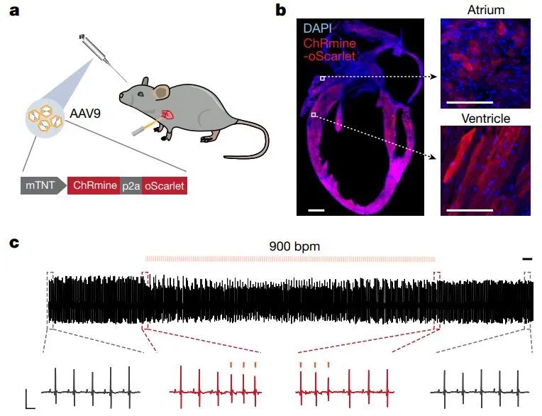 光学起搏器控制心率的原理与光遗传学调控神经活动有异曲同工之妙。它的基本原理是通过病毒载体向动物体内递送一个编码光敏离子通道ChRmine的基因,利用光信号靶向控制心肌细胞。当红光照射时,表达ChRmine的心肌细胞去极化,触发肌肉收缩,诱导心跳加快。
