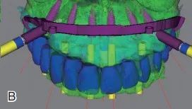 图2-B 序列导板设计,根据计划的骨修整量设计基础导板(紫色)