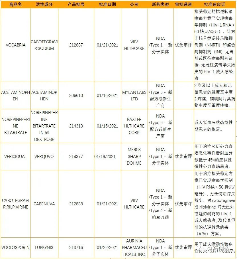 表1 2021年1月FDA批准NDA/BLA药物列表