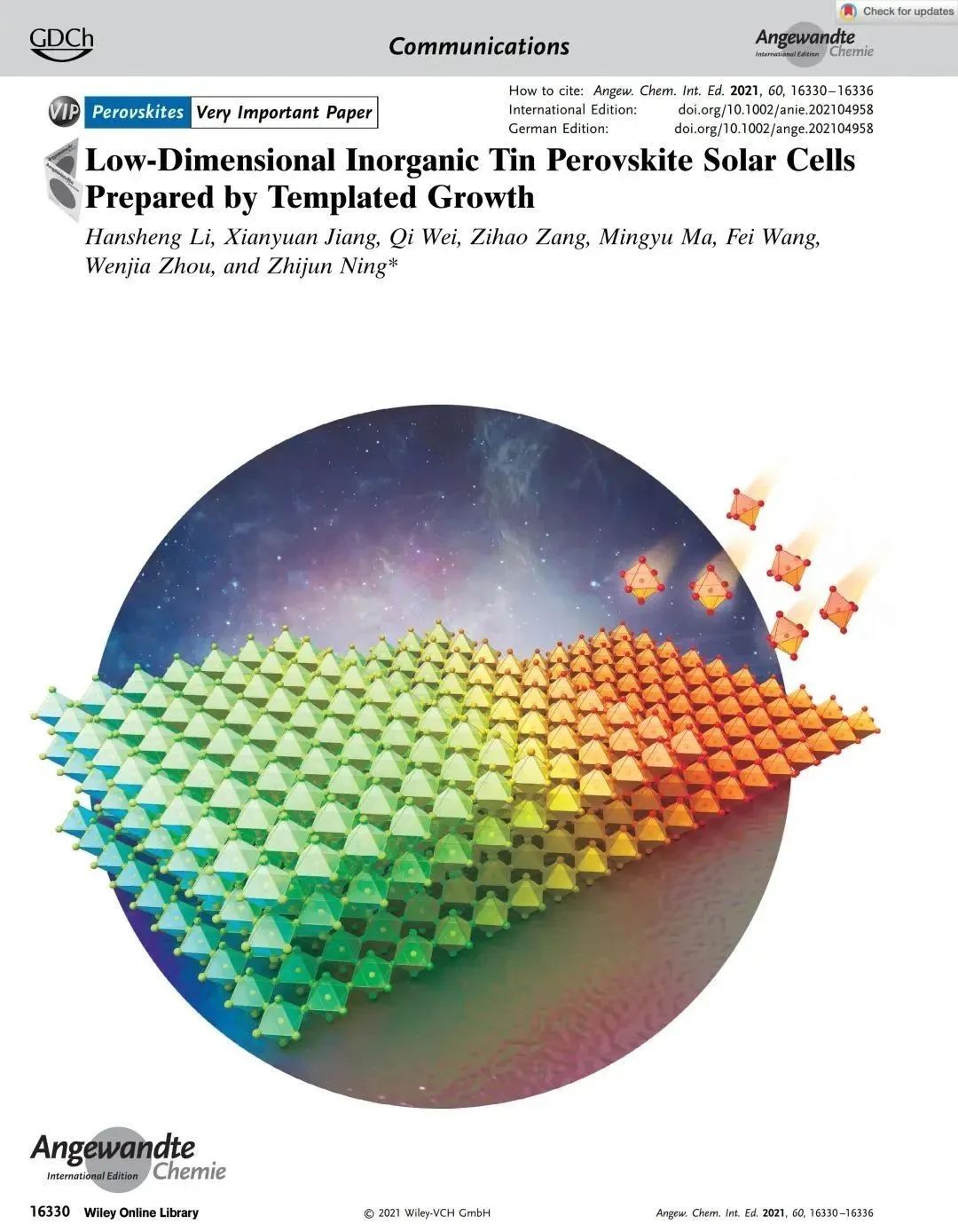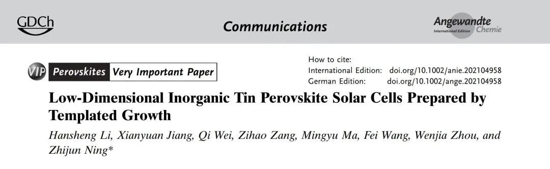 近日,上海科技大学物质学院宁志军课题组提出一种以低维钙钛矿诱导三维钙钛矿生长的方法,并基于该方法制备出了低维无机锡钙钛矿太阳能电池。相关研究成果以“Low-Dimensional Inorganic Tin Perovskite Solar Cells Prepared by Templated Growth”为题发表于国际学术期刊《德国应用化学》(Angewandte Chemie International Edition)。该项工作入选了Angewandte Chemie International Edition的Very Important Paper (VIP),并作为封面文章进行Highlight,期刊也对作者宁志军教授进行了专题介绍。