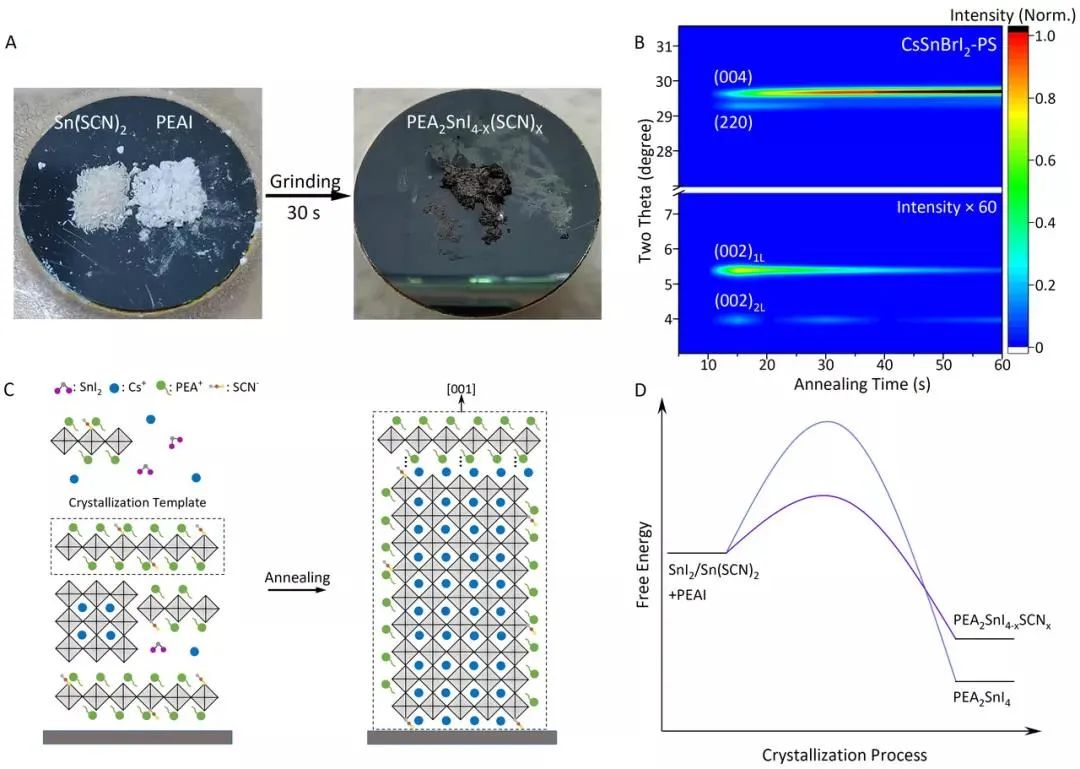 对此,宁志军组通过在钙钛矿前驱液中加入硫氰酸亚锡和苯乙胺盐来调控钙钛矿的生长:优先生成取向性较好的PEA2SnI4-xSCNx二维结构,再以该低维钙钛矿结构为模板诱导三维钙钛矿的生长。理论计算证明,含有硫氰根的低维钙钛矿结构具有较小的解离能,这降低了二维结构的结晶势垒。基于原位表征的结晶动力学跟踪实验观察到了二维结构中间体,证明了二维结构率先结晶,为后续三维钙钛矿的生长提供模板的机理。