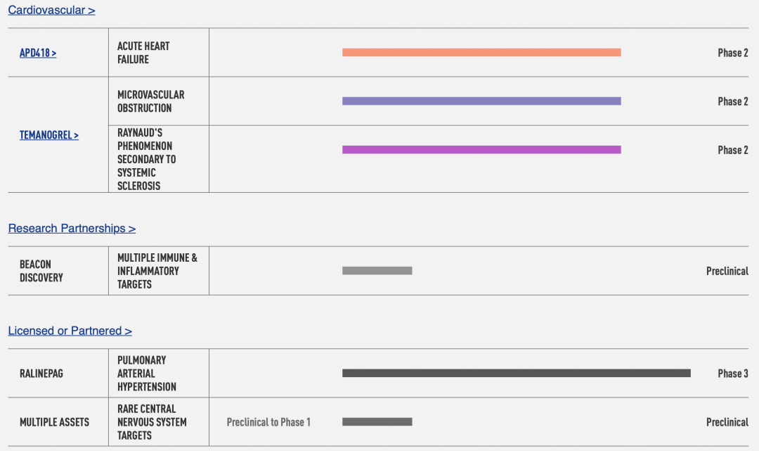 此外,Arena还有两个开发阶段的心血管管线,temanogrel和APD418。Temanogrel处于2期治疗系统性硬化症继发的微血管阻塞和Raynaud现象。APD418则在2期治疗急性心力衰竭。