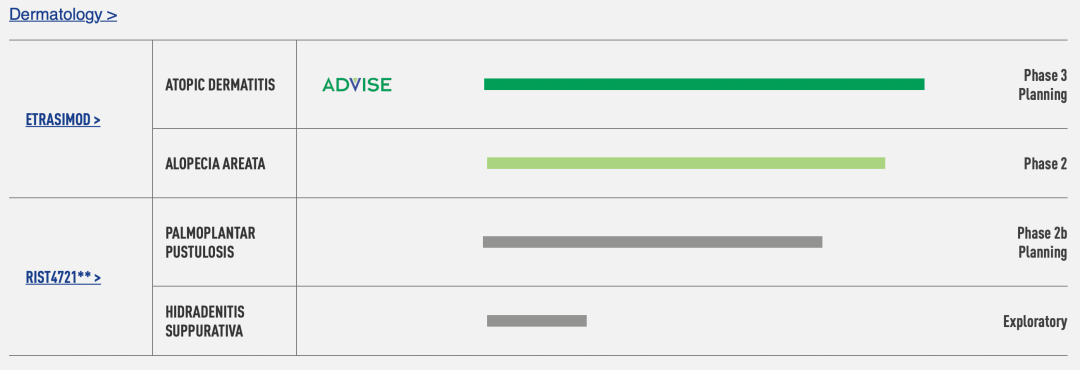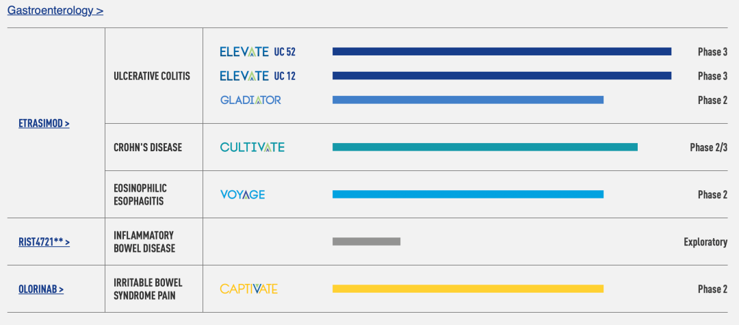 管线包括胃肠病学、皮肤病学和心脏病学的多种治疗候选药物,包括etrasimod,一种口服选择性1-磷酸鞘氨醇(S1P)受体调节剂,用于一系列免疫炎症疾病,如胃肠道和皮肤病。开发计划包括溃疡性结肠炎(UC)的两个3期研究、克罗恩病的2/3期研究、特应性皮炎3期研究以及嗜酸性食管炎和斑秃的2期研究。