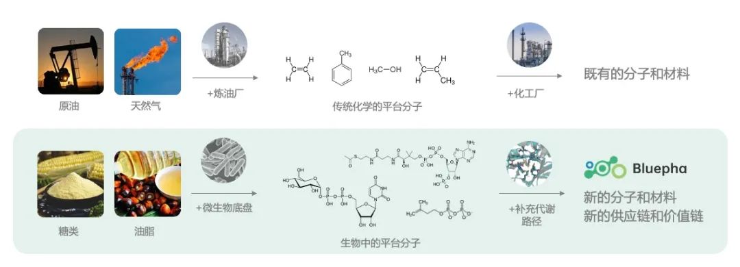 蓝晶微生物创造性地选择了几种在所有细胞中都存在的生物分子作为 “生物中的乙烯和甲苯”,开发了一系列以糖类或油脂作为原料高效合成 “平台分子” 的微生物细胞作为底盘。