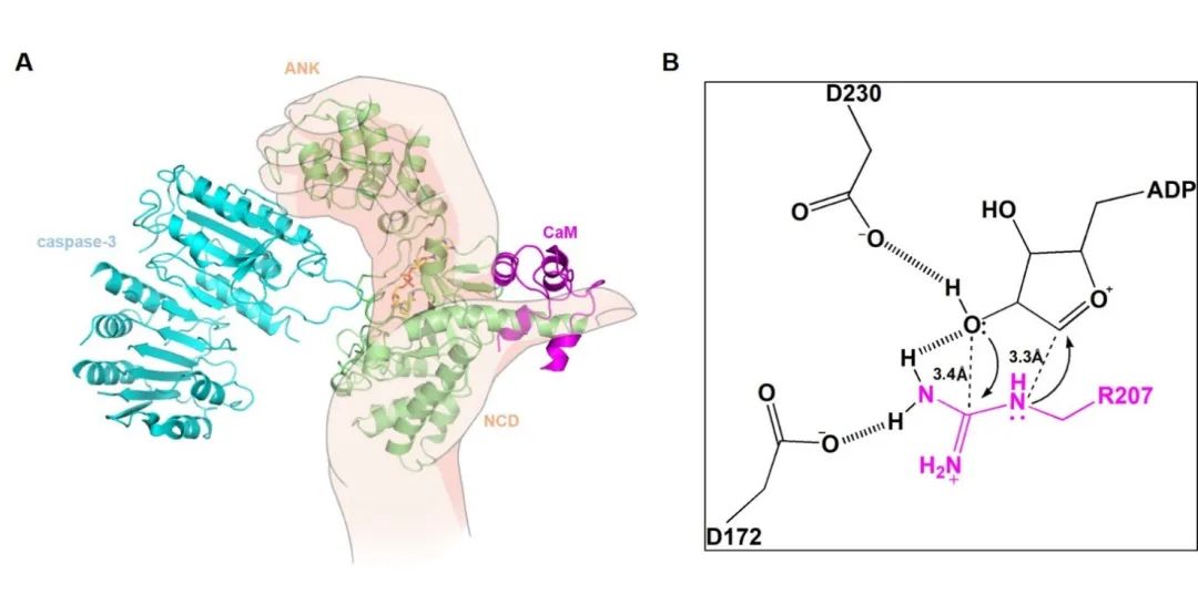 附近。与此同时,CopC上一个高度保守的天冬氨酸D172与R207形成氢键相互作用,将R207的侧链稳定在N-ribose附近。在已知的精氨酸ADP-核糖化过程中,一般是由精氨酸上的NH2对 NAD+中的烟酰胺进行亲核取代,连接至N-ribose的C1原子上。然而caspase-3 R207上的NE(Nδ)原子比NH2(Nω)更接近N-ribose的C1原子。NAD+的水解进一步缩短了N-ribose C1与R207 NE的距离,促进亲核取代反应的发生,使ADP-核糖基团转移至R207的NE原子上。随后N-ribose的2’-OH被活化,进攻精氨酸侧链胍基的碳原子,引发脱氨和环化反应,从而完成精氨酸的ADPR-deacylization修饰。