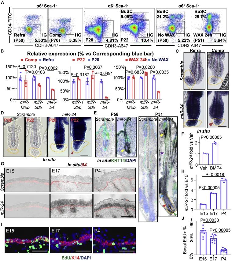 为了找出可能参与调节体内毛囊成体干细胞中的毛胚(HG)生长的关键因子,研究人员利用荧光激活细胞分选技术 (FACS)分离了HG细胞,并对富含HFSC的miRNA进行qRT-PCR分析。研究数据显示,miR-24在毛囊激活过程中显著下调,这进一步支持了miR-24是皮肤毛囊(HF)前体细胞激活的负调节因子的观点。