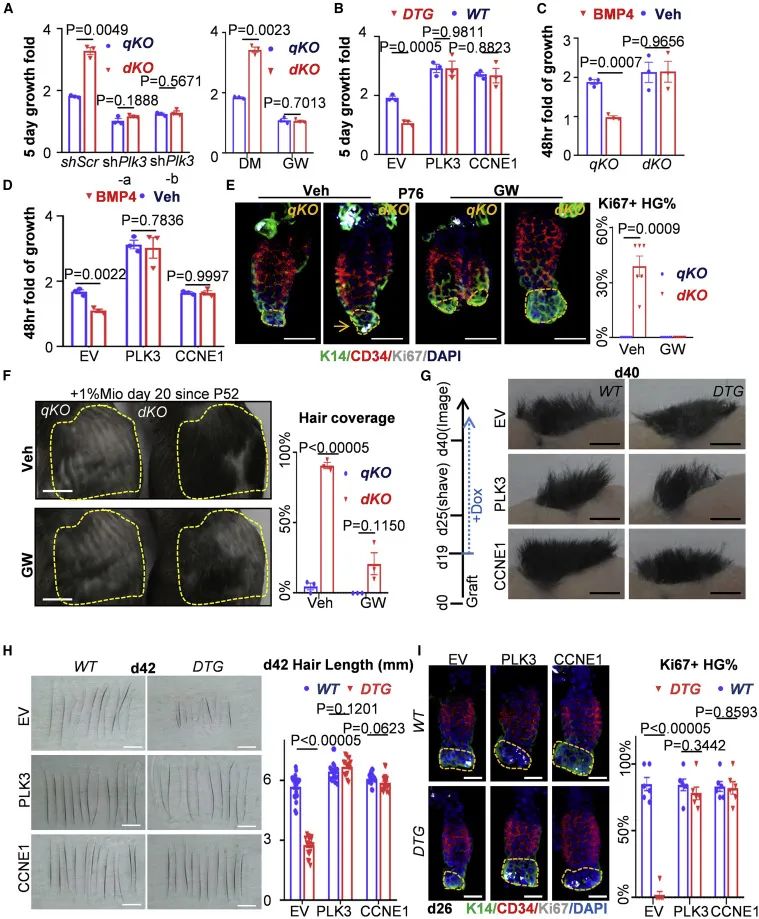那么,引起这一系列反应的核心人物是谁呢?科研人员基于RNA-seq观察了一系列miR-24相关的基因表达变化,发现了一种重要的miR-24靶标“Plk3蛋白”。通过体内与体外的双重验证结果显示,该蛋白能“挽救”因miR-24过表达引起的生长竞争劣势,并作为 HF 前体细胞体内生长能力的关键性miR-24靶标。