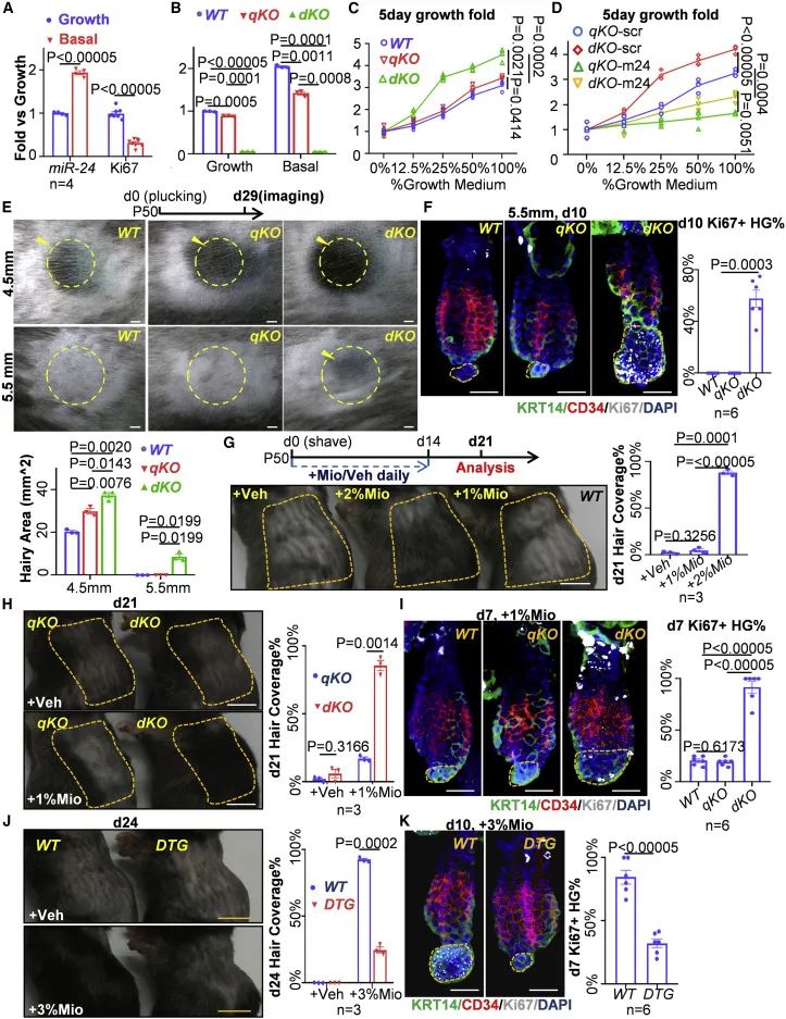 不仅如此,经过进一步的验证发现,在缺乏生长因子的培养环境下,小鼠表皮角化细胞 (MK)中的miR-24会先显著上调,且miR-24在MK中的过表达会延缓毛囊前体细胞的激活与毛发周期推进,相反,如果将该基因敲除,毛发周期就会被缩短。这说明miR-24的消融将增强皮肤上皮细胞对生长刺激的敏感性。