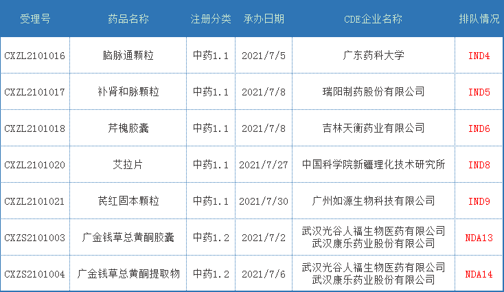 7月共7个中药1类创新药受理号获得承办,均为IND申请;下表为7月新承办的中药1类创新药。
