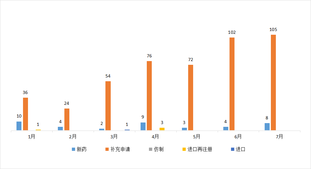 7月份CDE承办新的中药注册申请受理号共计113个,其中新药8个,补充申请105个;2021年1-7月CDE中药各申请类型受理情况详见图三。
