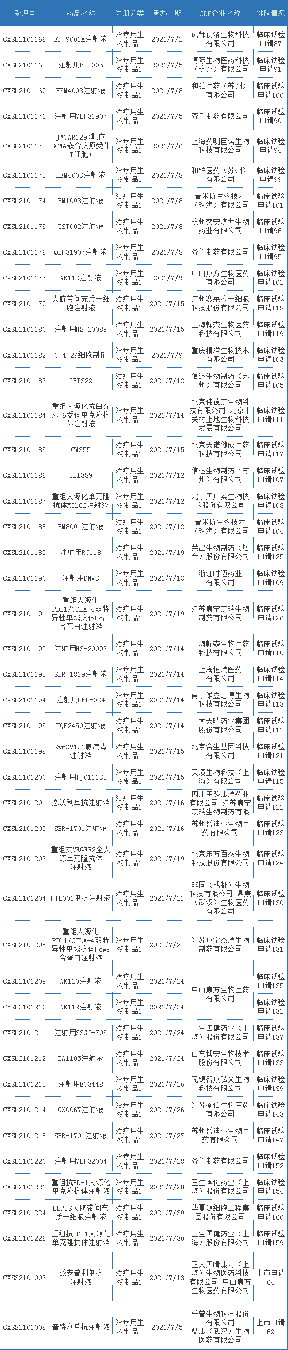 7月有46个1类治疗用生物制品受理号获得承办,其中临床试验申请44个,上市申请2个,目前均已经进入相应序列排队待审;下表为7月新承办的生物制品1类创新药。