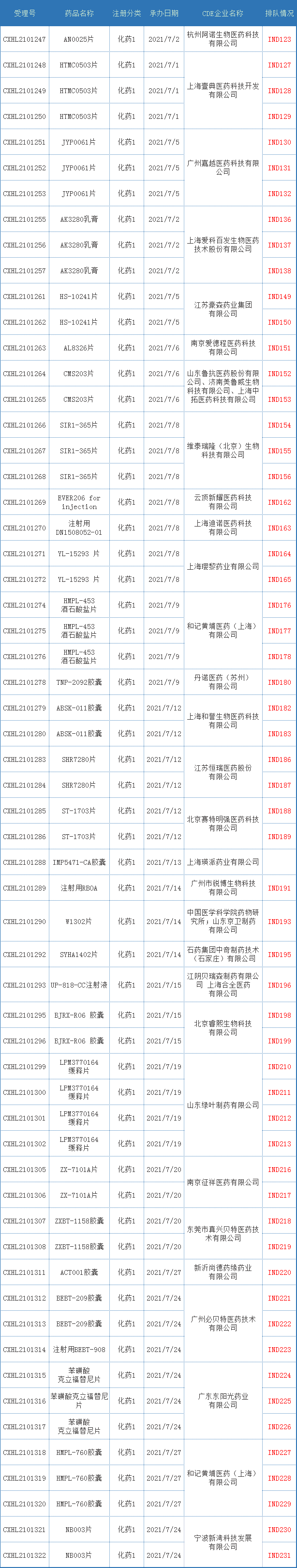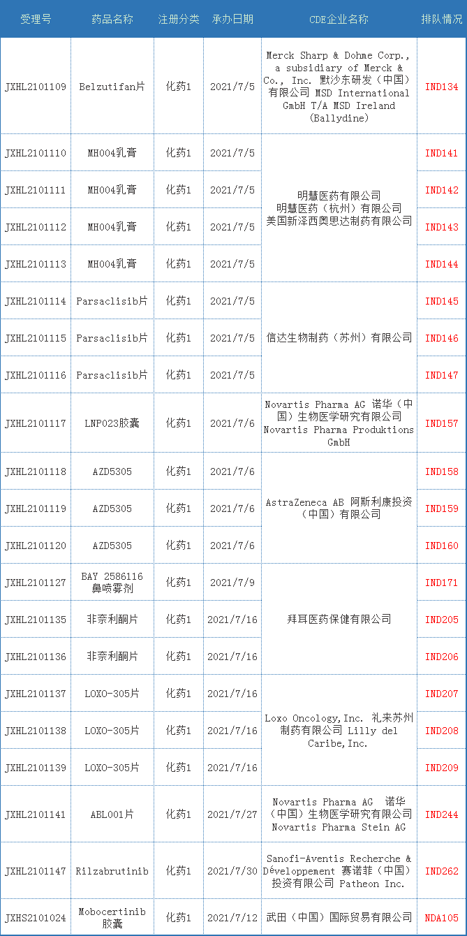 7月CDE受理化药国产1类新药共计80个(按受理号计),其中是IND申请76个,NDA申请3个,涉及41个品种36家企业;下表为7月新承办的1类国产新药。