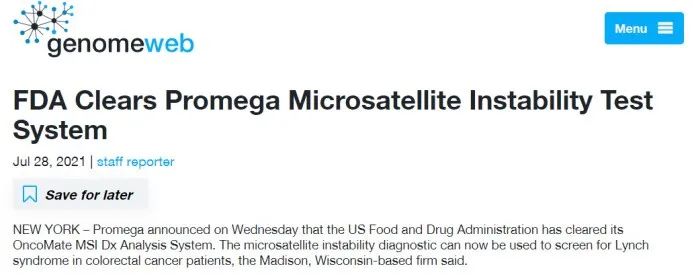 7月28日,美国Promega公司宣布,其OncoMate MSI Dx(MSI即Microsatellite Instability,微卫星不稳定性)试剂盒获得FDA批准。