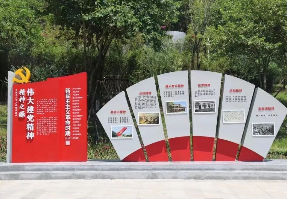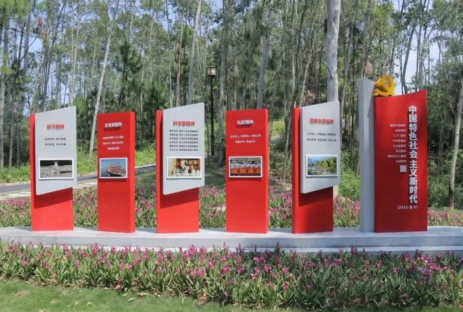 沿登山步道而行,建党精神的景观小品,讲述着自新民主主义革命时期、社会主义革命和建设时期、改革开放和社会主义现代化建设新时期到中国特色社会主义新时代以来4个重大历史时期伟大的建党精神,生动展现了中国共产党开天辟地、改天换地、翻天覆地、惊天动地的百年奋斗史、实践史。
