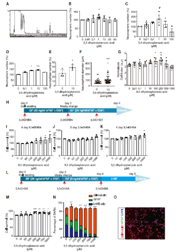 之后,研究人员使用其异构体2,3-DHBA、3,4-DHBA和3,5-DHBA处理神经元前体细胞,发现3,5-DHBA具有显著的促前体细胞增殖和促神经生成活性,使神经元前体细胞的存活率提高,增加bIII-微管蛋白和神经元的比例,同时显著增加了神经球数目和大小。其他异构体也具有稍低的促神经活性。研究人员还在小鼠体内验证了这一功能。