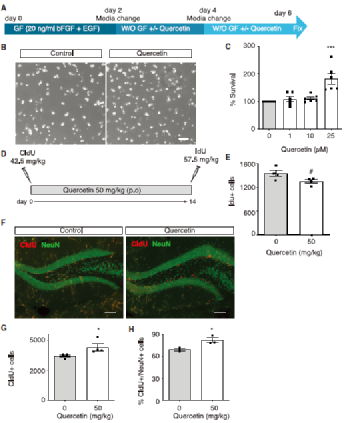 槲皮素是苹果皮中最丰富的黄酮醇类化合物,有研究发现,其与多种神经保护机制,特别是小胶质细胞功能相关,还具有清除活性氧和发挥抗氧化作用的能力。由于神经前体细胞是海马中成年神经元的起源,因此,研究人员首先通过碘脱氧尿苷(IdU)标记、流式细胞术以及蛋白免疫印迹等方法检测了槲皮素体外和口服处理对神经前体细胞存活、增殖以及神经元分化的影响。