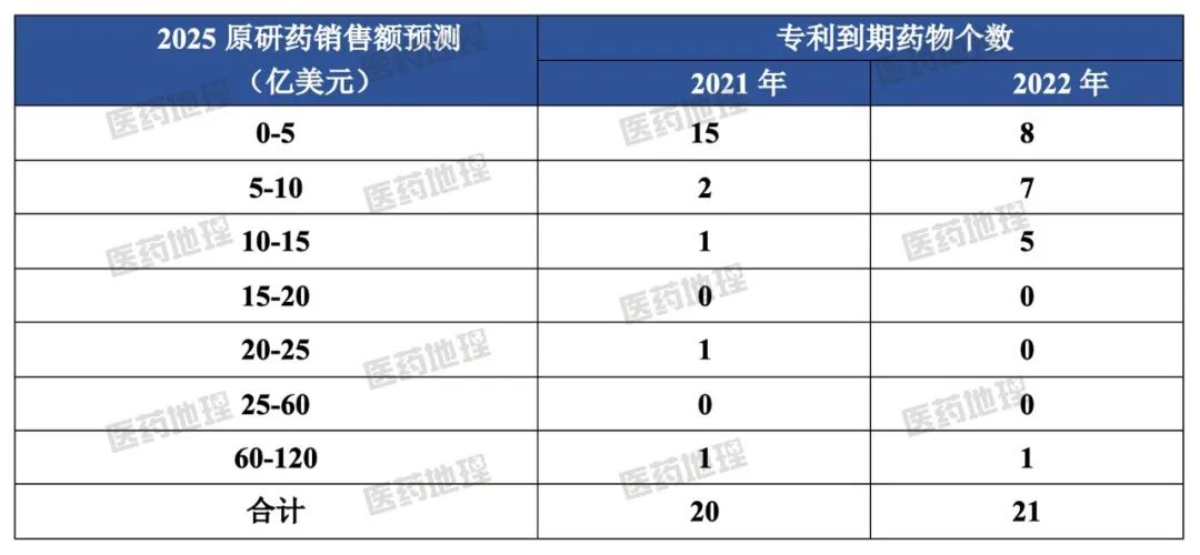 2021及2022年专利到期药物预期市场规模
