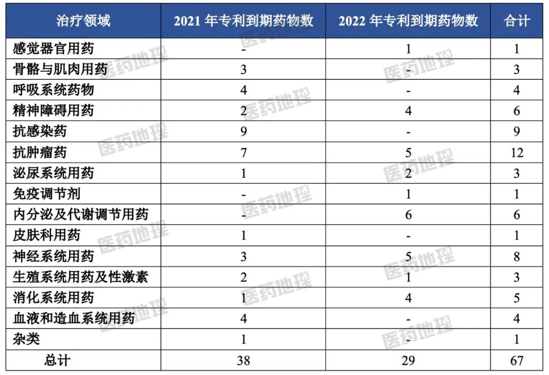 表1:2021及2022年专利到期药物数量及治疗领域分布