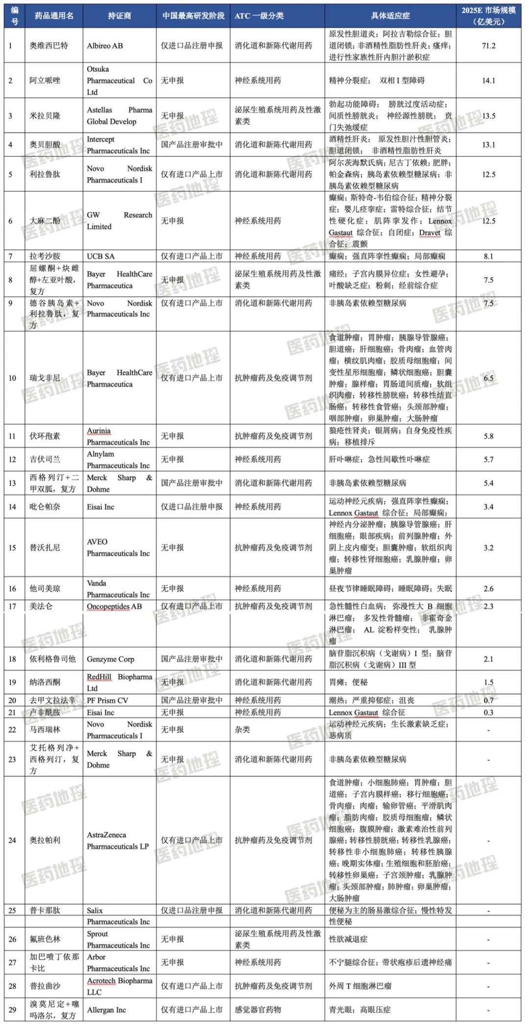 表3:各治疗领域/通用名专利到期药物2025市场规模预测