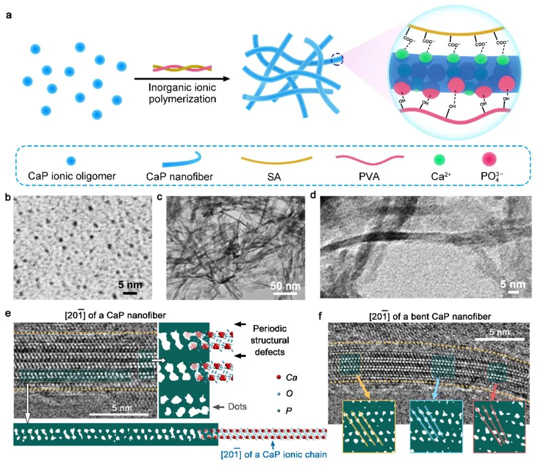 基于上述的工作,作者制备了 CaP 离子寡聚体作为前驱体,并以 PVA 和 SA 作为仿生有机分子来控制 CaP 寡聚体的无机离子聚合。CaP 寡聚体在 PVA 和 SA 的调节下经历仿生矿化过程,产生了具有周期性结构缺陷的柔性 CaP 纳米纤维。