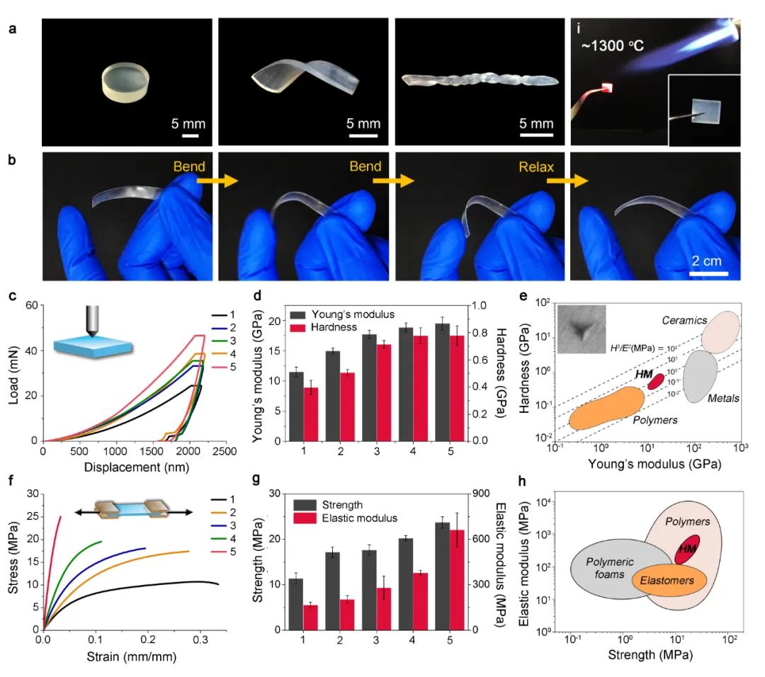 HMs 表现出像塑料一样的柔性和韧性,可以被塑造成不同的形状。即使是矿物含量高达的 81.7wt% 的 HM 样品,也可以弯曲至 90 度而不发生脆性断裂。同时,矿物成分赋予它们更高的硬度和热稳定性。矿物含量 81.7wt% 的 HM 样品具有高杨氏模量(19.52±1.04 GPa)和高硬度(0.78±0.07 GPa)。传统的 CaP 复合材料不可能具有如此高的矿物含量并保持结构的完整性。