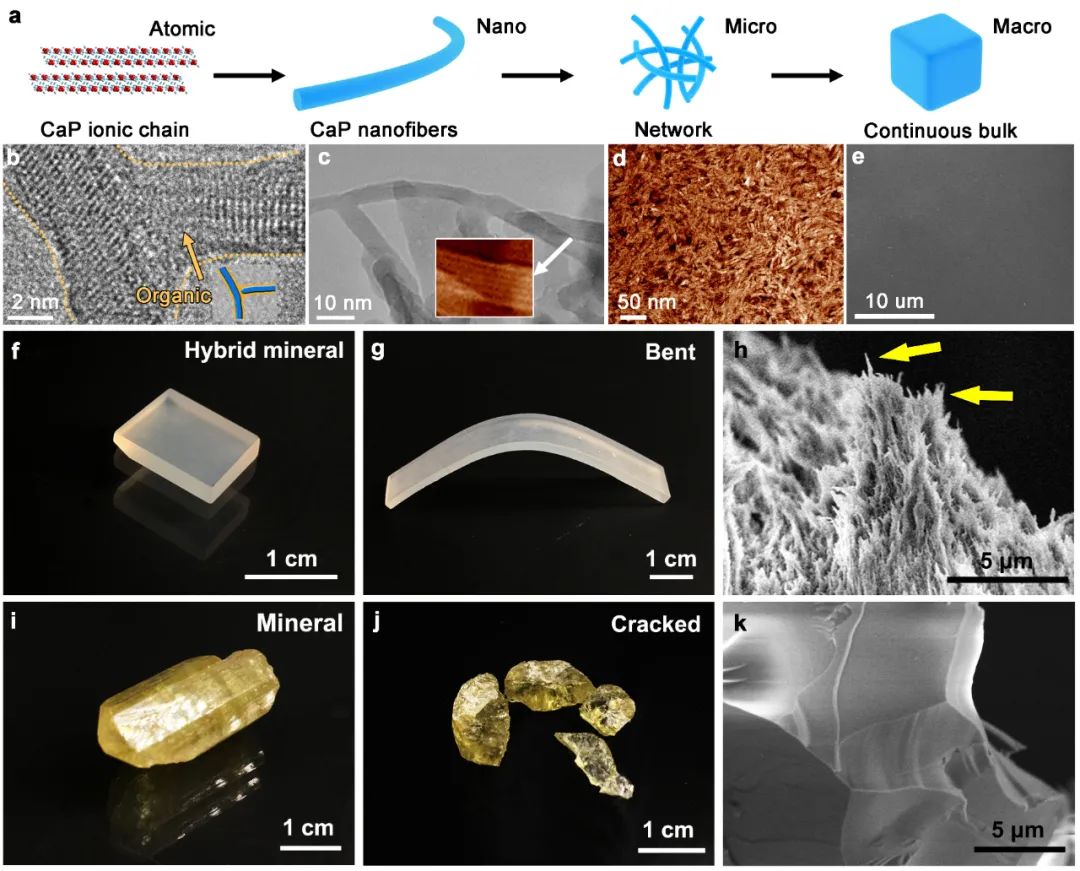 这些 CaP 纳米纤维被进一步分层组装成网络和大块材料,由于其矿物组成和低的有机聚合物含量,被命名为复合矿物(HMs)。