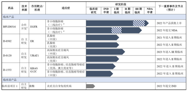 招股书显示,益方生物自主研发的第三代表皮生长因子受体(EGFR)酪氨酸激酶抑制剂BPI-D0316,可用于治疗EGFR突变阳性的非小细胞肺癌(NSCLC)。目前,BPI-D0316已完成NSCLC二线治疗的2期注册临床试验,新药上市申请(NDA)已于2021年3月获得中国国家药品监督管理局(NMPA)受理,预计2022年有望获得上市批准。此外,BPI-D0316一线治疗NSCLC的2/3期注册临床试验已完成患者入组,临床试验尚在进行之中。