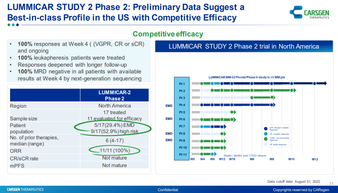 今年9月,科济药业在第七届CAR-TCR年度峰会上公布了一项II期临床试验的初步结果。截至2022年8月31日,17名复发/难治多发性骨髓瘤患者在该临床试验中接受泽沃基奥仑赛输注,且中位随访时间113天。结果显示,在11名至少8周随访的可评估的患者中,4例患者伴随EMD,11例患者客观缓解率为100%(非常好的部分缓解、完全缓解或严格完全缓解),并在更长时间的随访观察到更深的缓解。由于所有的缓解都在进行中,中位无进展生存期、中位生存期和中位缓解持续时间尚未达到,并且完全缓解/严格完全缓解率尚未成熟。所有的在第四周有MRD结果的患者,通过二代测序MRD均为阴性。安全性方面,没有出现死亡,没有患者经历过3级或者更高的细胞因子释放综合征。