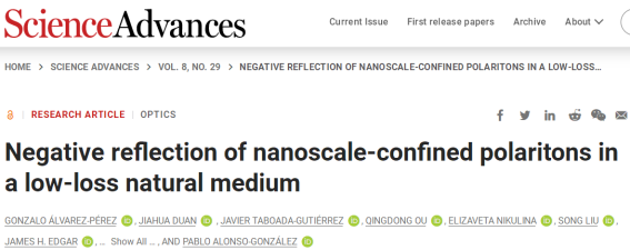 1.Álvarez-Pérez, G., Duan, J. et al. Negative Reflection of Nanoscale-Confined Polaritons in a Low-Loss Natural Medium. Science Advances, 8. 29, abp8486 (2022).https://doi.org/10.1126/sciadv.abp8486