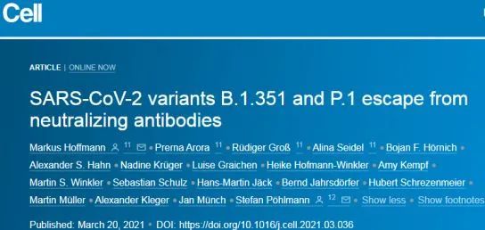 Markus Hoffmann et al. SARS-CoV-2 variants B.1.351 and P.1 escape from neutralizing antibodies. Cell, 2021, doi:10.1016/j.cell.2021.03.036.