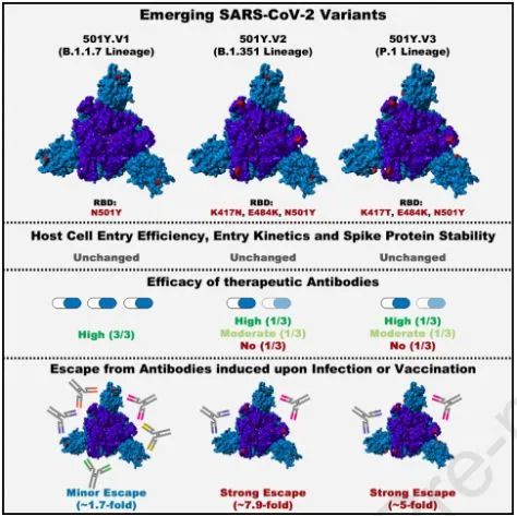 Münch说,“我们发现,某些阻断进入宿主细胞并处于(临床前)临床开发的抗病毒药物对这些病毒变种的抑制作用与原始病毒一样好。目前在德国迅速传播的变种B1.1.7也能被抗体有效抑制,包括疫苗接种诱导的抗体。相比之下,用于COVID-19疗法的抗体并不能抑制变种B.1.351和P.1。此外,这两种变种被来自康复者或疫苗接种者的抗体较差地抑制,它们部分地绕过了这些抗体的中和作用。”
