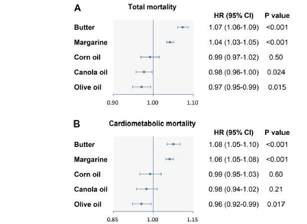 在平均16年的随访期间,共发生了129328例死亡。多变量调整后,研究人员使用Cox比例风险回归模型对食用油与全因死亡率间的关联进行了评估,发现黄油和人造黄油的摄入与较高的全因死亡率密切相关,而低芥酸菜子油和橄榄油的摄入均与全因死亡率成反比,玉米油与其无关。每天多食用1汤匙黄油或人造黄油,全因死亡率会分别增加7%和4%。相反,菜籽油或橄榄油消耗量每增加1汤匙/天,全因死亡率会分别降低2%和3%。