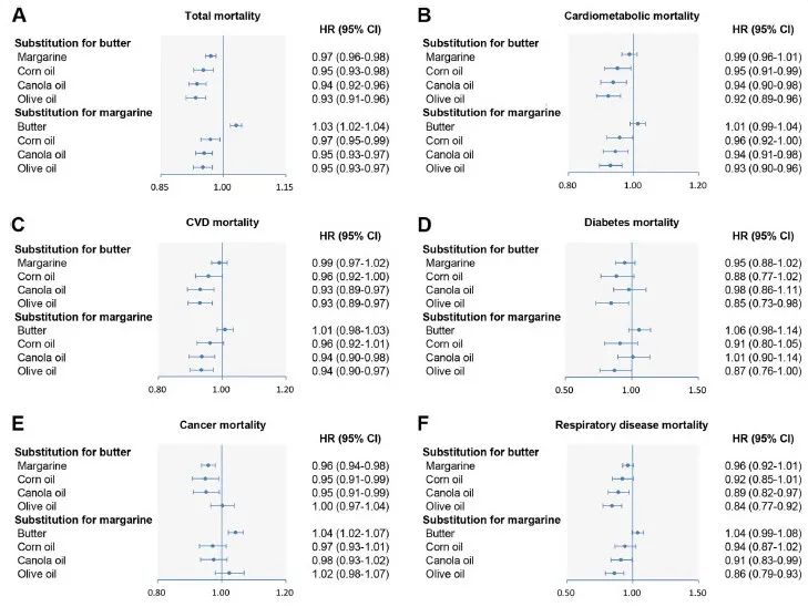 如果用较为健康的玉米油、低芥酸菜子油或橄榄油替代等量的黄油会有什么效果呢?分析结果显示,用1汤匙/天这三种较为健康的食用油替代等量的黄油或人造黄油,可使全因死亡率降低5%到7%,使心脏代谢死亡率降低4%到8%,同时CVD、RD、AD和糖尿病引起的死亡率也会降低7%到25%。