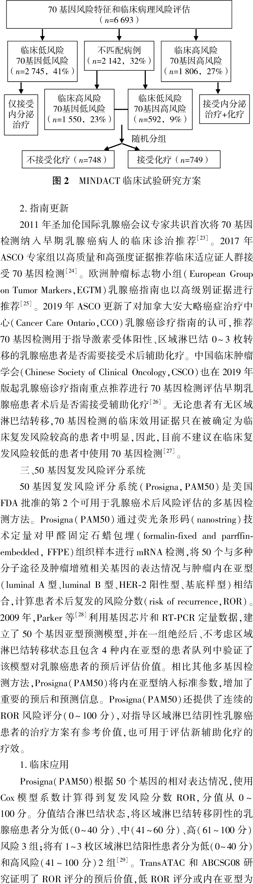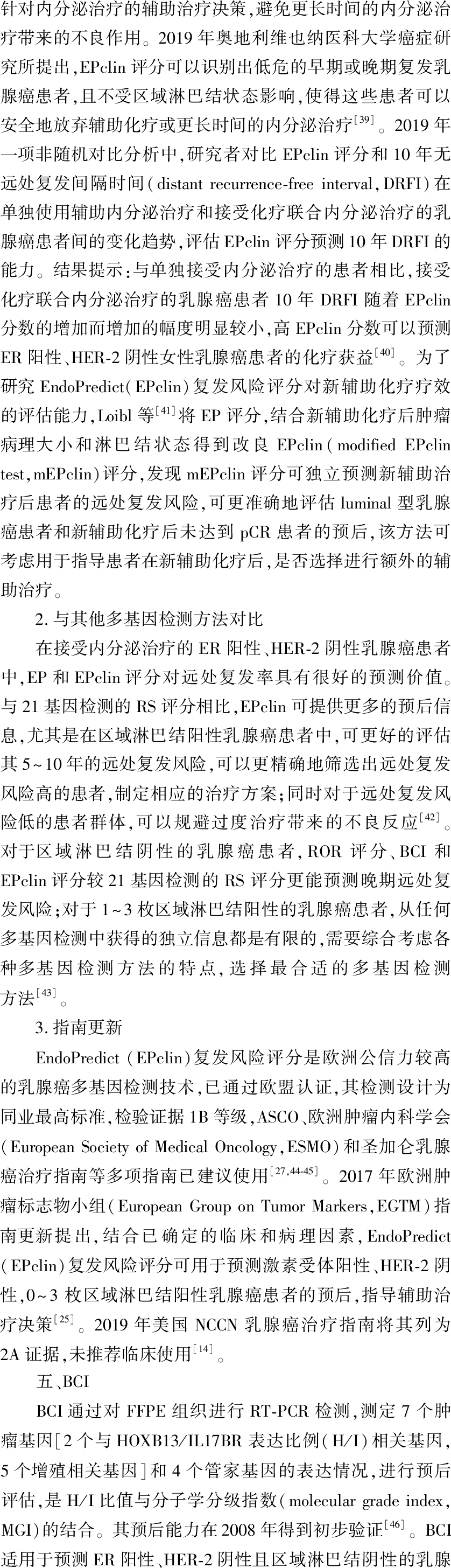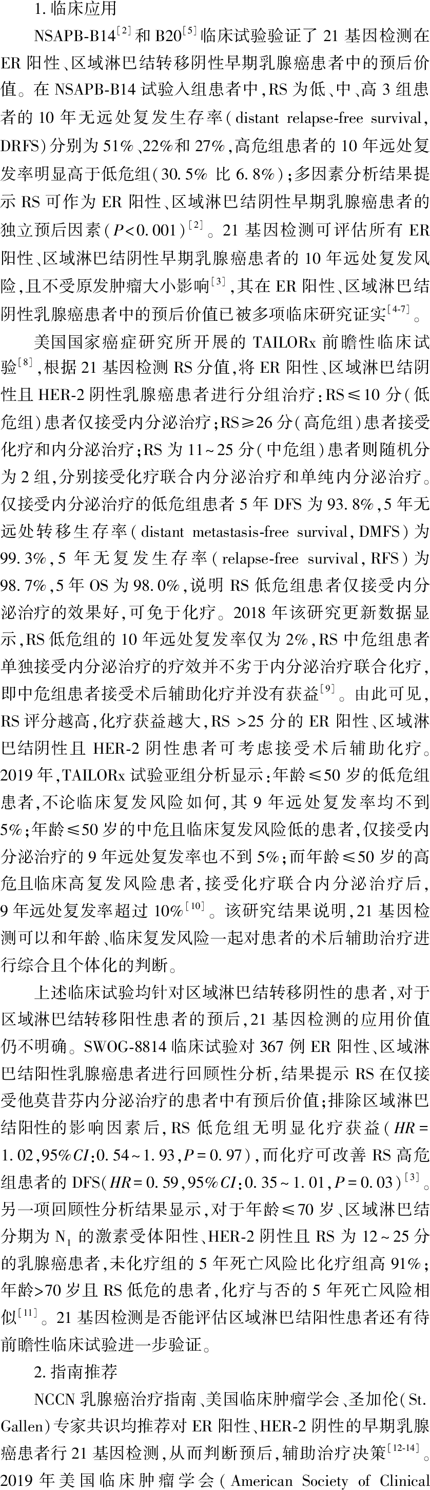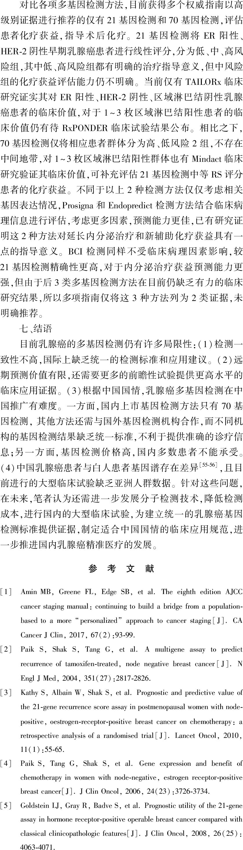 乳腺癌多基因检测技术对早期乳腺癌患者的预后判断和指导患者术后辅助治疗方案有着重要的参考价值。乳腺癌多基因检测可评估早期乳腺癌患者的复发风险,帮助判断患者预后,预测药物疗效并指导个体化治疗。每种多基因检测有不同的评判标准,通过将患者划分为各个风险组来评估预后,决定治疗策略。笔者针对目前常用的多基因检测技术,包括21基因检测(OncotypeDX)、70基因检测(MammaPrint)、50基因复发风险评分系统(PAM50)、12基因EndoPredict(EPclin)、7基因乳腺癌复发指数(BCI)在乳腺癌中的应用与研究进行综述。