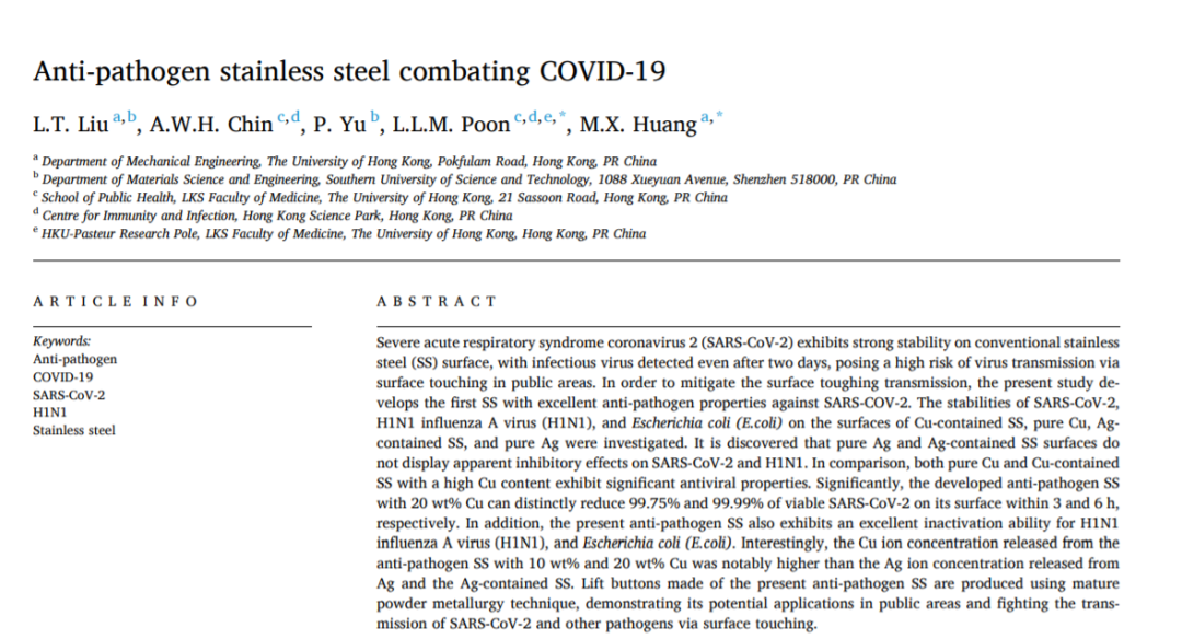 近日,香港大学工程学院机械工程系黄明欣教授领导的团队,与港大李嘉诚医学院免疫与感染研究中心潘烈文教授的研究团队合作,发明了一种高铜含量的不锈钢,能成功杀灭存留于其表面包括新冠病毒在内的抗病原体。
