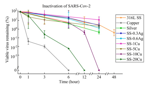 研究人员表示,他们新开发的不锈钢合金可以在3小时内灭活 99.75% 的 SARS-CoV-2 病毒,在6小时内灭活 99.99%。