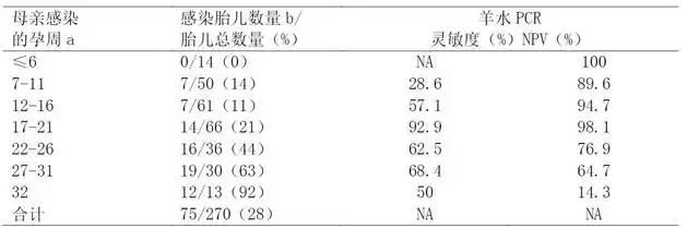 表 7 母亲感染的孕周与胎儿感染和羊水 PCR 的关系