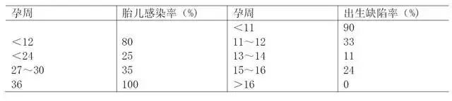 当母体感染 / 暴露发生在孕早期,胎儿感染率约 80%,晚中期降至 25%,后期又增加,从孕 27-30 周感染率为 35%,至孕 36 周后感染率几乎 100%。孕 11 周前感染先天缺陷率为 90%,孕 11-12 周为 33%,孕 13-14 周为 11%,孕 15-16 周为 24%,孕 16 周后为 0。
