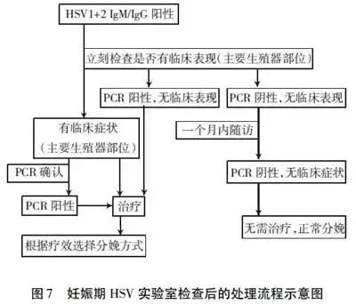 妊娠期 HSV 血清学筛查可以明确孕妇是否感染病毒。而妊娠前和妊娠期 HSV 对比筛查是为了确定初次感染还是复发感染,以便提供治疗和干预的依据,目的是预防新生儿感染。妊娠期实验室检查后的处理流程,见图 7.