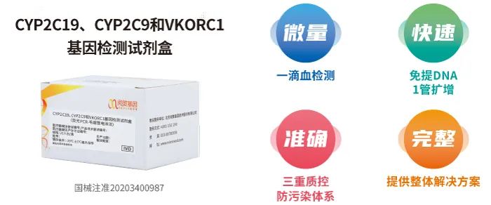 CYP2C19、CYP2C9和VKORC1基因检测试剂盒可在一管体系中同时检测氯吡格雷和华法林相关3个基因、6个位点的基因型多态性(SNP),快速辅助医生为患者定制个性化治疗方案。该款试剂盒与传统试剂盒相比,仅需一滴血即可完成检测,可减轻患者抽血痛苦;搭配智阅分析仪金标准平台,并加入野生型、杂合型、纯合突变型三重质控及防污染体系,为结果准确性保驾护航;采用直接PCR扩增技术和多重荧光PCR技术,省去提取纯化步骤的同时,可在1管中实现多重反应,从样本到报告仅需2.5h,大大节省检测时间,提高心血管疾病患者的抗栓疗效。