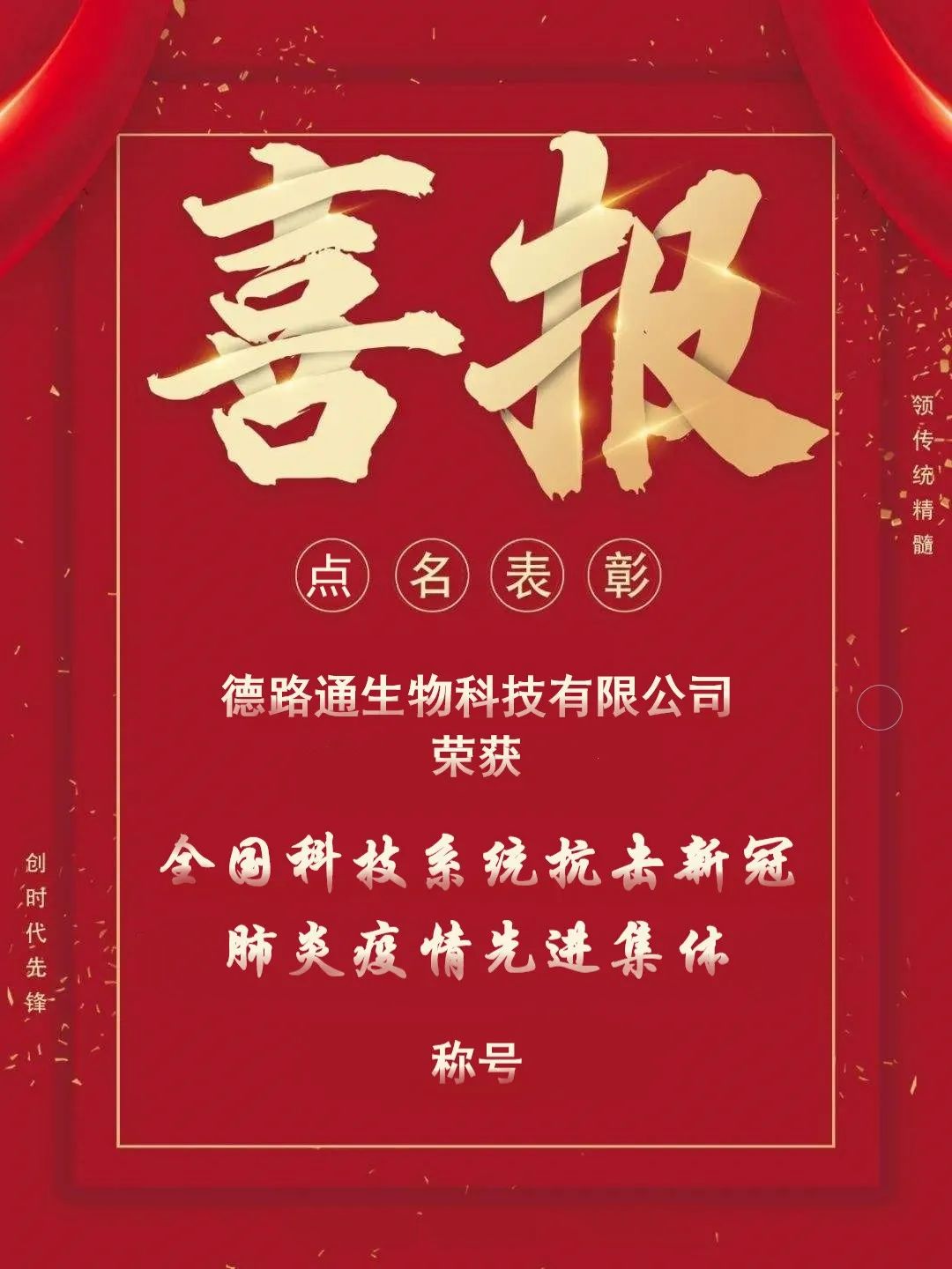 为大力弘扬伟大抗疫精神和科学家精神,充分激发广大科技工作者的责任感、使命感和荣誉感,日前科技部印发《关于表彰全国科技系统抗击新冠肺炎疫情先进集体和先进个人的决定》,授予163个集体“全国科技系统抗击新冠肺炎疫情先进集体”称号,高新区德路通(石家庄)生物科技有限公司榜上有名,以实际行动展现了新时代科技工作者的忠诚担当和精神风貌。